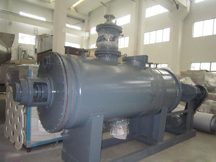 干燥机结构简单,操作方便,使用周期长,性能稳定可靠,蒸汽耗量小,适用性能强,产品质量好,特别适用于不耐高温、易燃、调温下易氧化的膏状物料的干燥,该机经用户长期使用证明是一良好的干燥设备。原理:被干燥物料从壳体上方正中间加入,在不断正反转动的耙齿的搅拌下,物料轴向来回走动,与壳体内壁接触的表面不断新,受到蒸汽的间接加热,耙齿的均匀搅拌,粉碎棒的粉碎,使物料表面水分有利的排出,气化的水分经干式除尘器、湿式除尘器、冷凝器,从真空泵出口处放空。